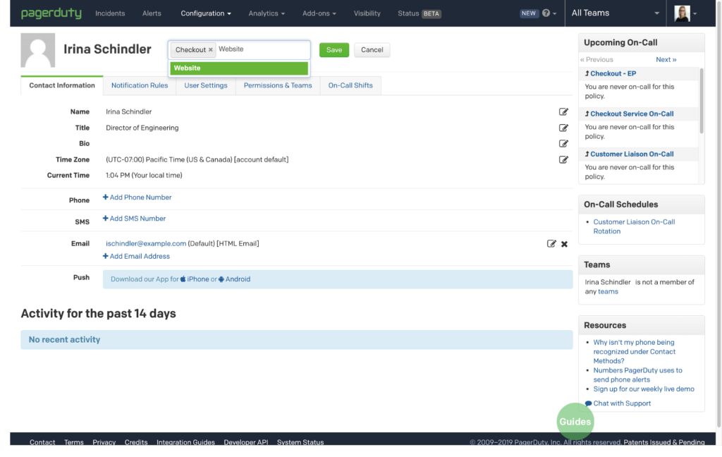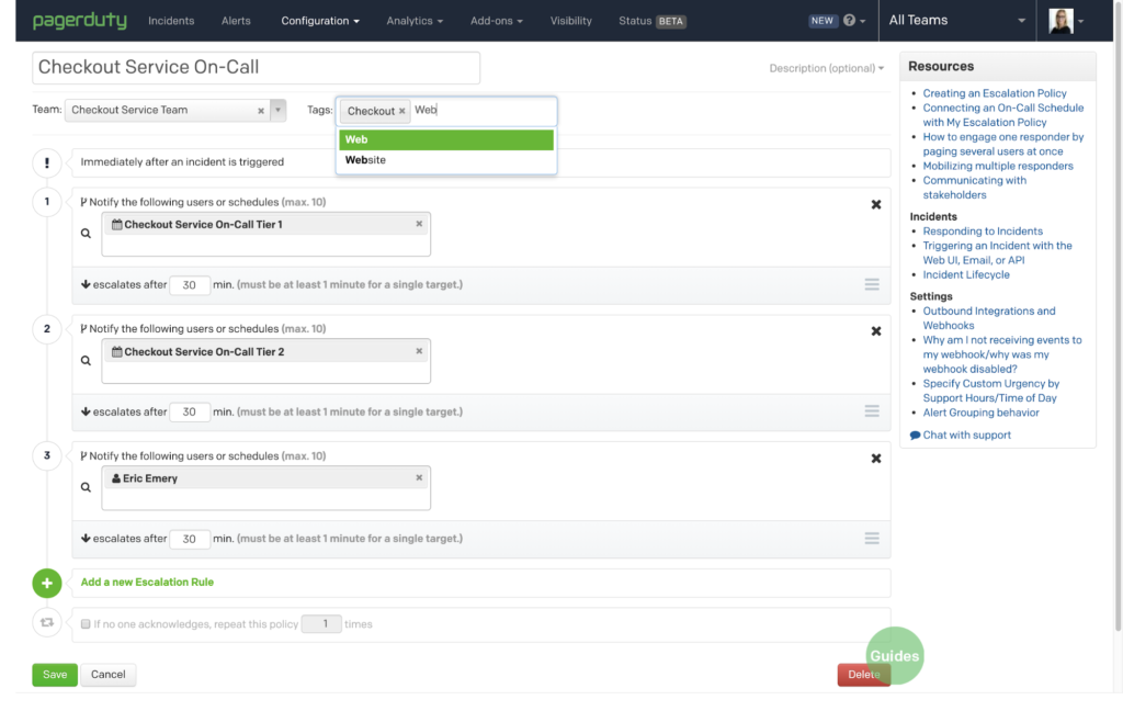 Mit Kontextuelle Suche Mit können Sie PagerDuty -Objekten, einschließlich Teams, Eskalationsrichtlinien und Benutzern, einfache Tagging-Metadaten hinzufügen. So erhalten Sie zusätzlichen Kontext, der Einsatzkräften und Managern die Navigation und Organisation der gewünschten Objekte erleichtert und die Neuzuweisung von Vorfällen vereinfacht. Tagging geht Hand in Hand mit der Kontextsuche, sodass Sie Eskalationsrichtlinien filtern können, wenn Sie einem Vorfall zusätzliche Einsatzkräfte hinzufügen. Die folgenden Screenshots bieten einen kurzen Überblick über das Tagging von PagerDuty -Objekten.