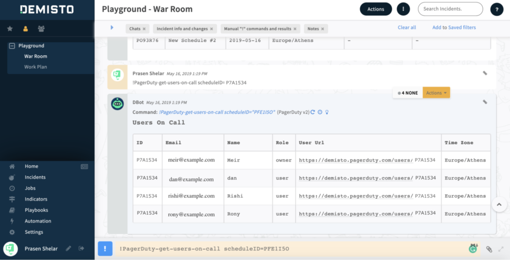- Zugriff auf Bereitschaftspläne, Kontaktmethoden und Benachrichtigungsdetails von PagerDuty innerhalb der Demisto-Instanz