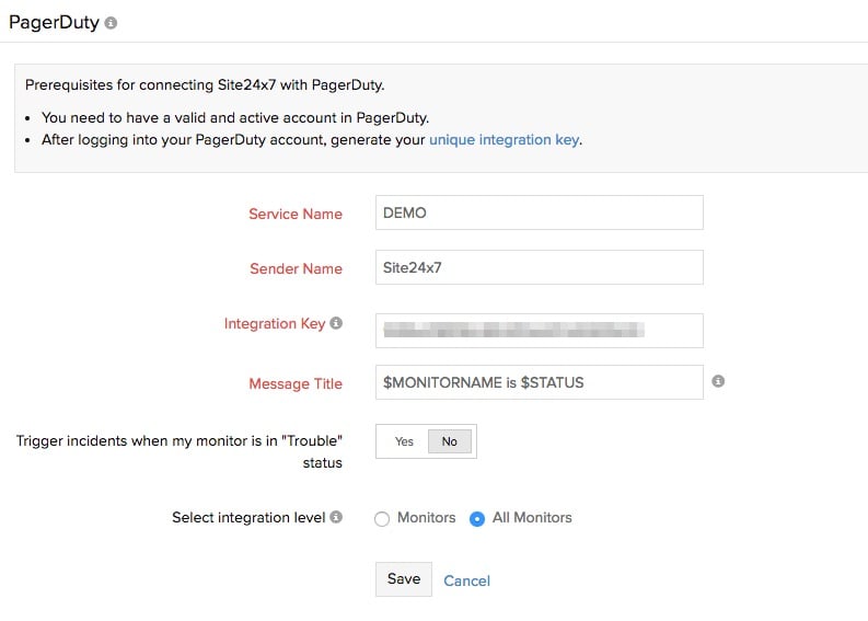 Site24x7 is a cloud infrastructure monitoring service that helps monitor the uptime and performance of websites, online applications, servers, and public and private cloud monitoring all from a single console. The integration with Site24x7 allows you to receive website alerts from Site24x7 directly to your PagerDuty account. Below steps will help you to successfully integrate alerts.
