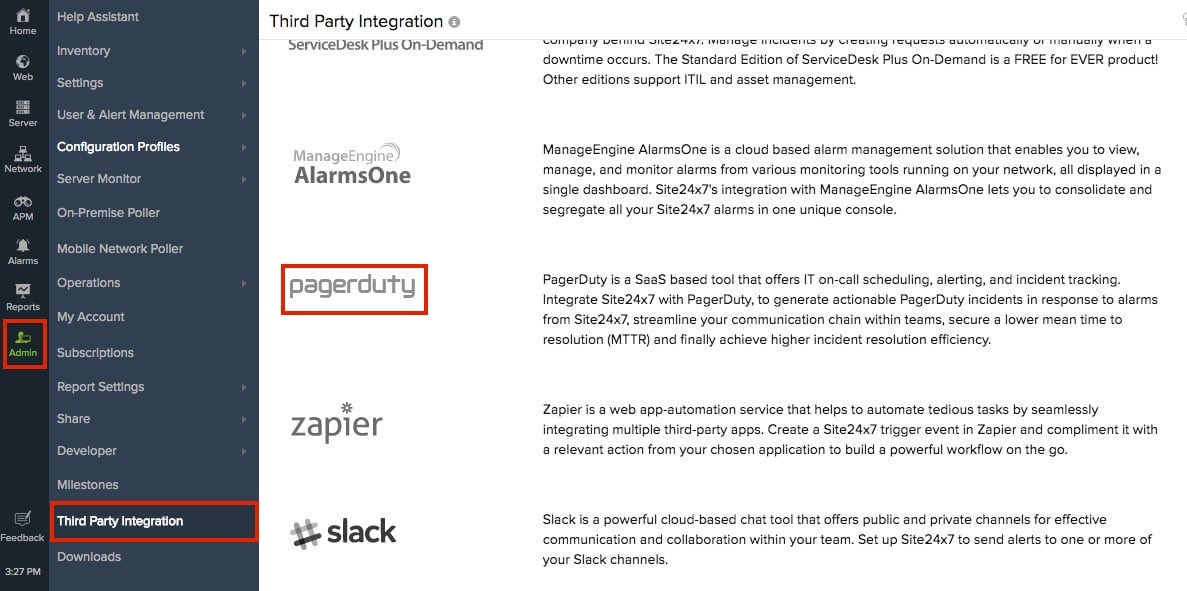 - On the left hand-side click on Admin, and then click Third Party Integrations, then click on the PagerDuty logo.