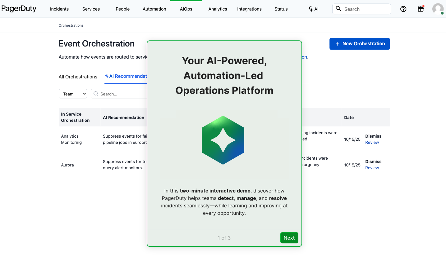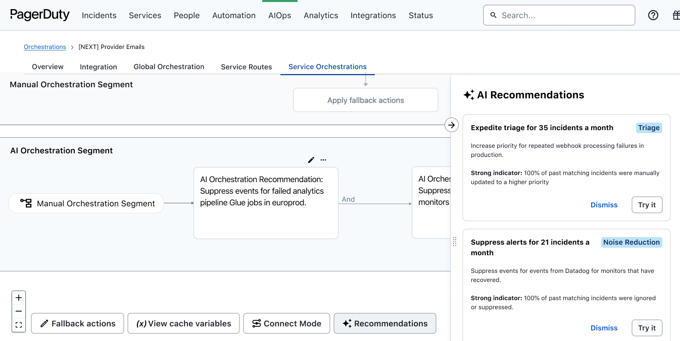 Shift work from reactive to proactive by leveraging AI to identify areas for improvement based on past responder behavior. Using machine learning that has been fed historical event and incident data, AI Orchestrations will be able to suggest actionable event orchestration rules to create event-driven automations.