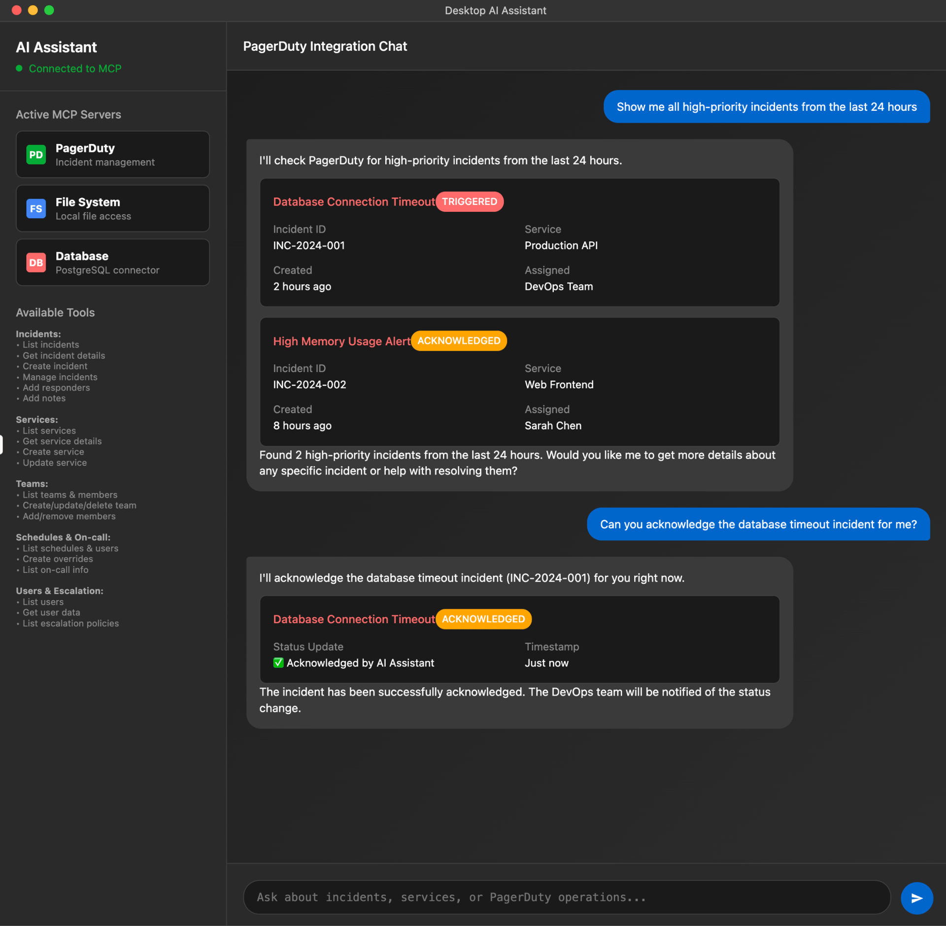 PagerDuty’s MCP server allows LLMs and AI agents to connect directly to PagerDuty’s APIs. Teams can pull PagerDuty incident and service data into their AI tools —like AI-powered IDEs —enabling seamless automation and response workflows.