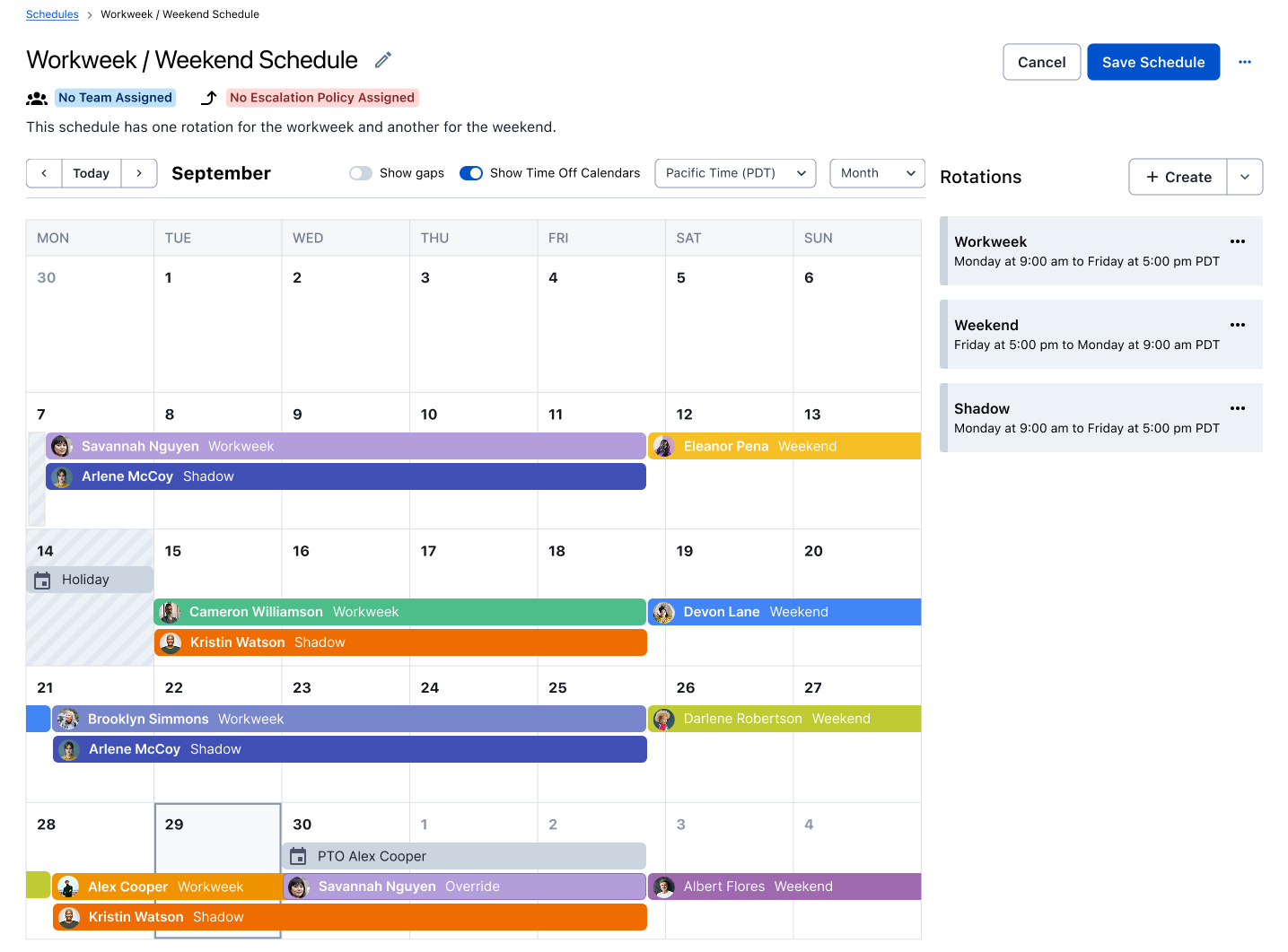 Create iCalendar-based rotations from quick start patterns, support multiple on-call responders, and identify coverage gaps in minutes.