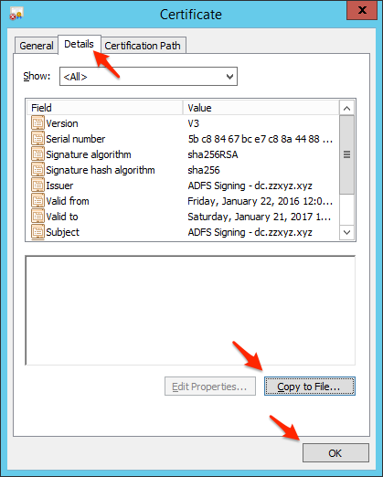 - Go to the Details tab and click Copy to File... and click Next on the Certificate Export Wizard introduction.