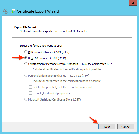 - Select Base-64 encoded X.509 (.CER) and click Next.