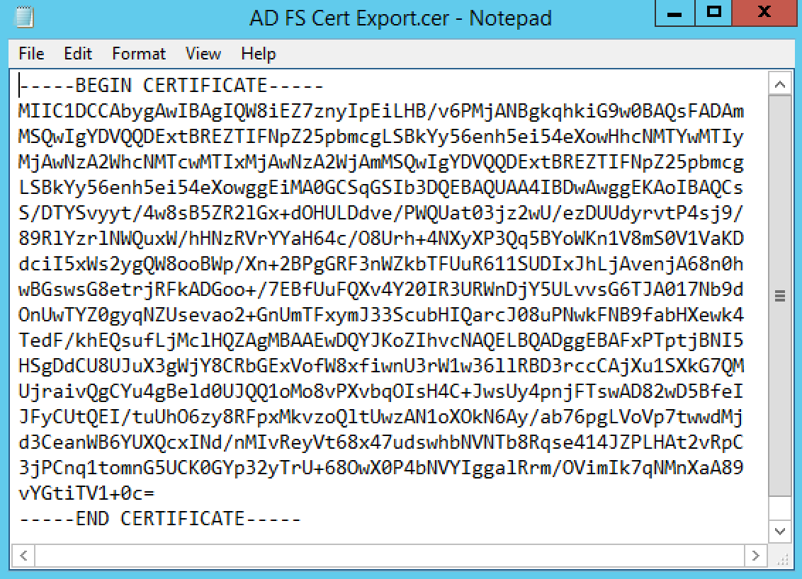 - Open the certificate file you exported in Notepad (or another plain text editor) and copy the contents.Note: You must include the