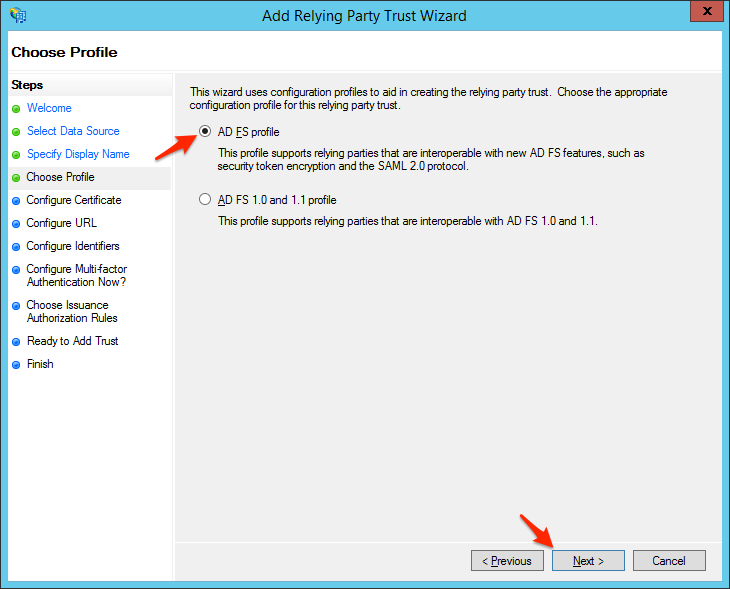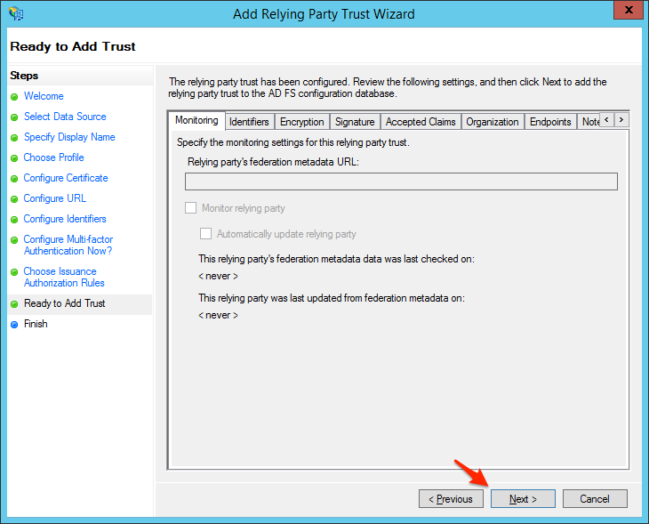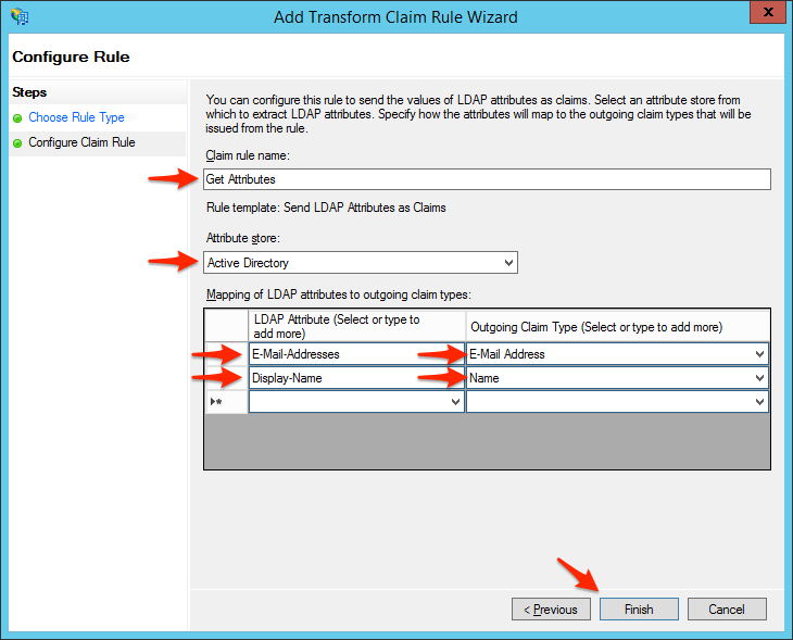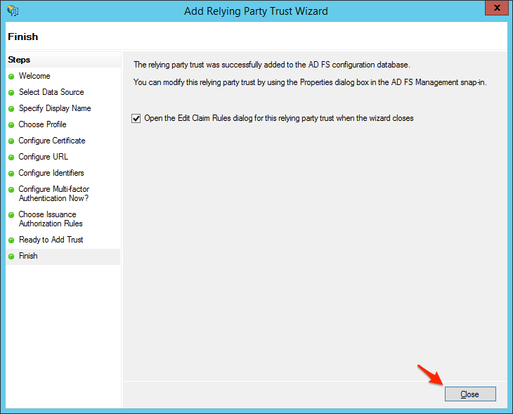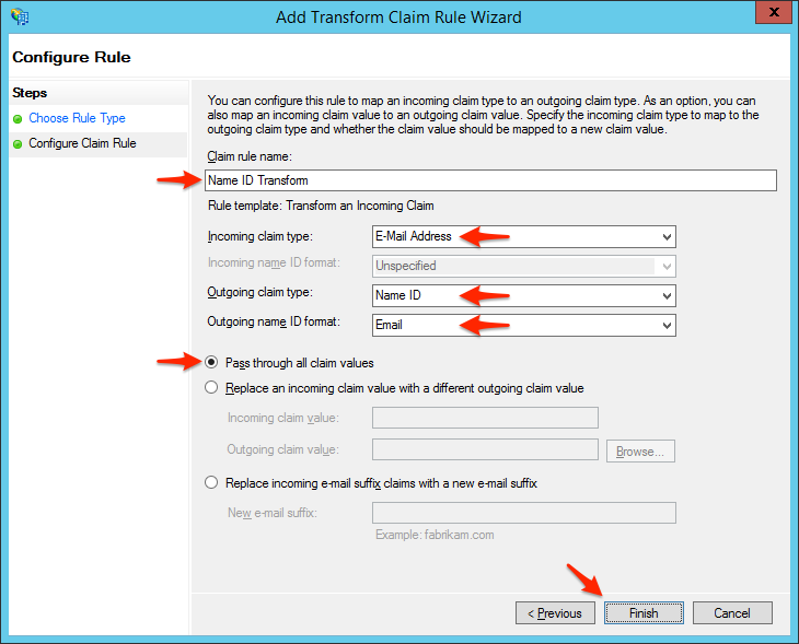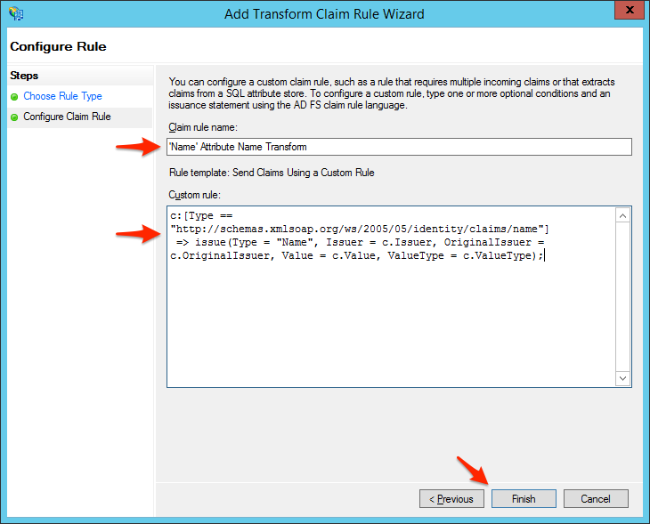 c:[Type == "https://schemas.xmlsoap.org/ws/2005/05/identity/claims/name"] => issue(Type = "Name", Issuer = c.Issuer, OriginalIssuer = c.OriginalIssuer, Value = c.Value, ValueType = c.ValueType);Click Finish when you are done.