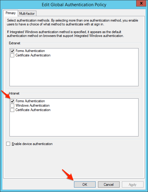 - Under Intranet, check Forms Authentication and click OK.Note: This is required for Windows Server 2012 R2. Previous versions of Windows already have Forms Authentication enabled by default. Also note that enabling Forms Authentication will apply to all sites configured, not just PagerDuty.An alternative option is to set forms as a fall back authentication method for intranet using the following PowerShell command: