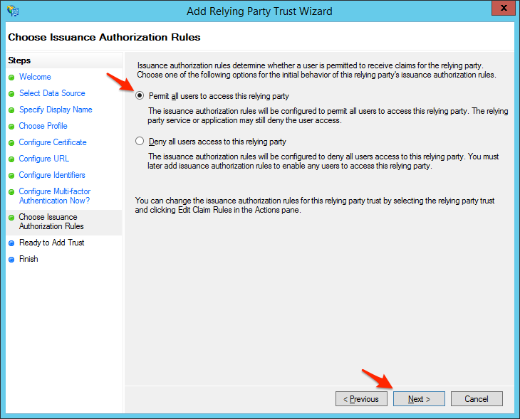 - Select Permit all users to access this relying party and click Next.Note: You may change this setting to deny by default and grant only specific users access to PagerDuty, however this process is outside the scope of this guide and will not be covered.