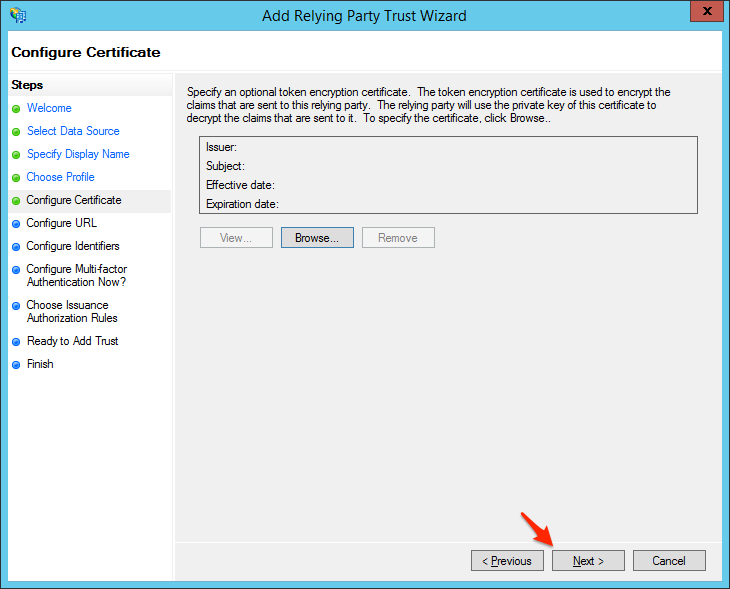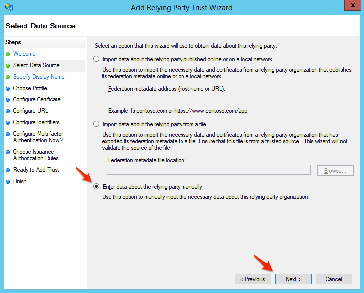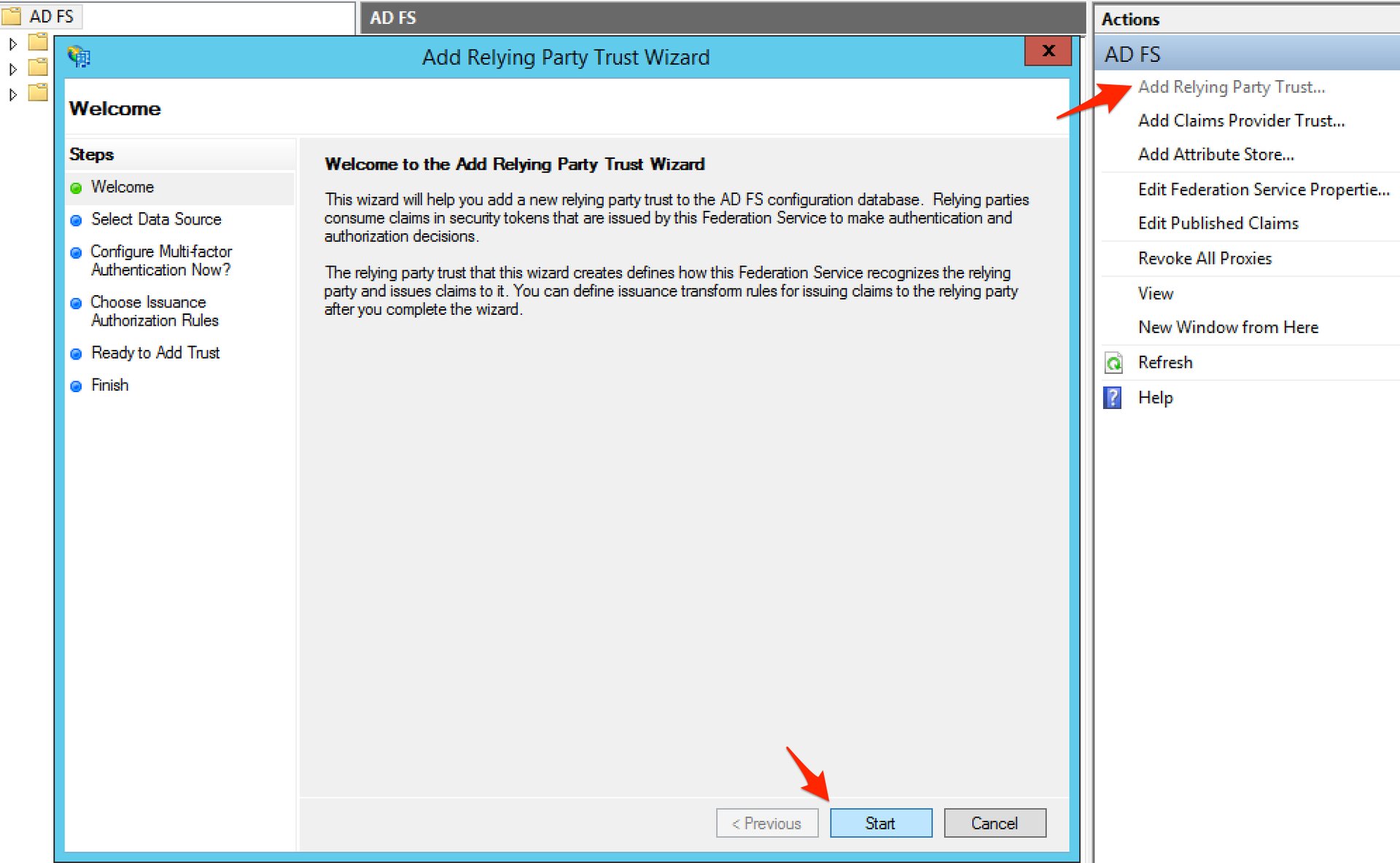 - Open the AD FS Management console, click Add Relying Party Trust... in the Actions pane and click Start on the wizard introduction page.