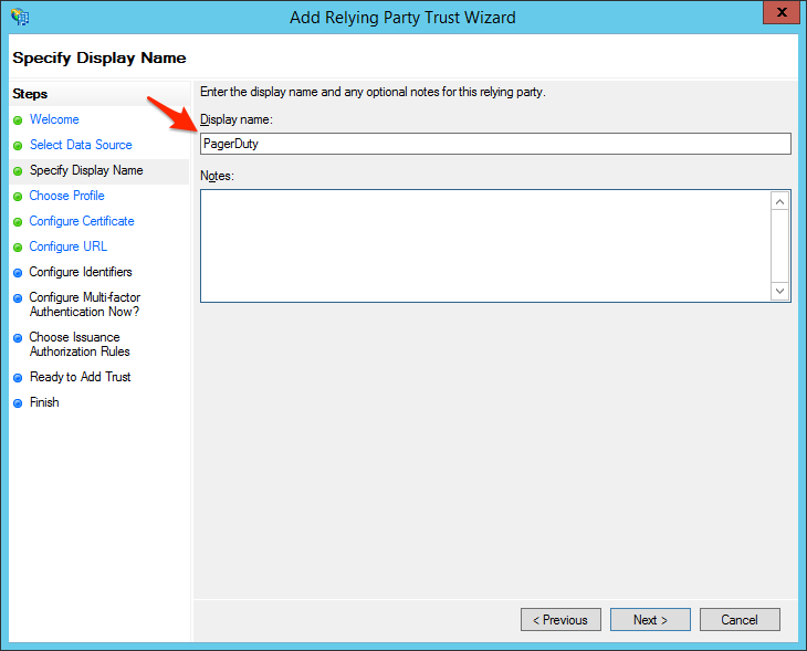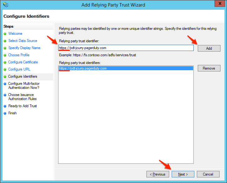 - Enter your PagerDuty subdomain in the Relying party trust identifier field - including