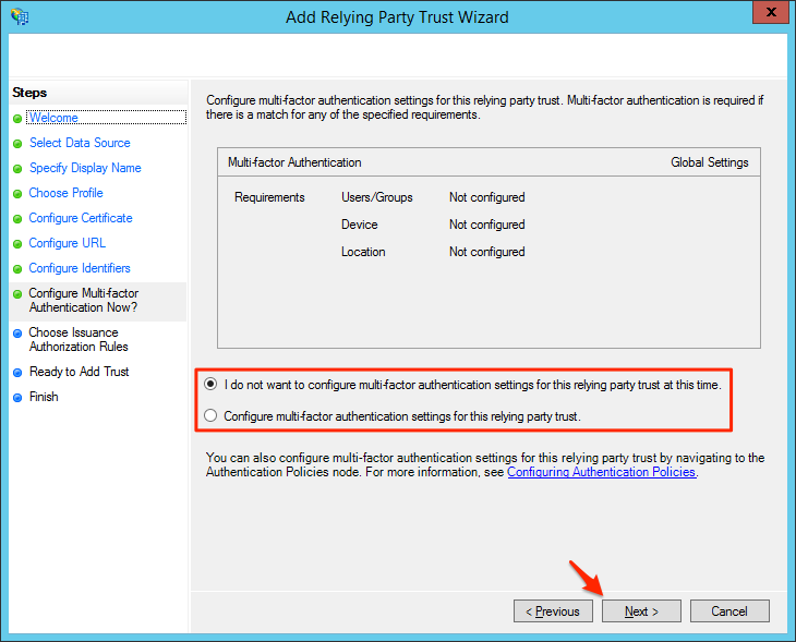 - Select your desired multi-factor authentication option for users and click Next.Note: Enabling multi-factor authentication will require additional steps that are outside the scope of this guide and will not be covered.