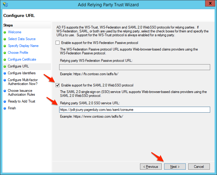 - Back on your AD FS server, check the box to Enable support for the SAML 2.0 WebSSO protocol, then paste the URL you copied in the Relying party SAML 2.0 SSO service URL box and click Next.
