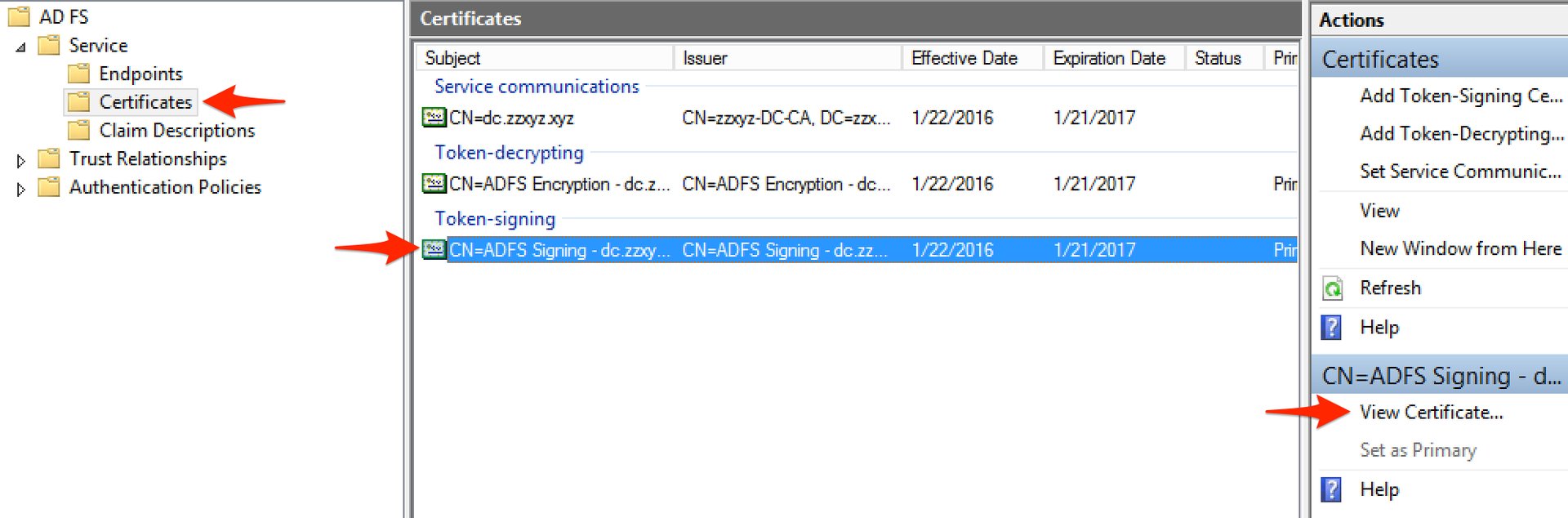 - Go to Service > Certificates, select your Token-signing certificate and click View Certificate... in the Actions pane.