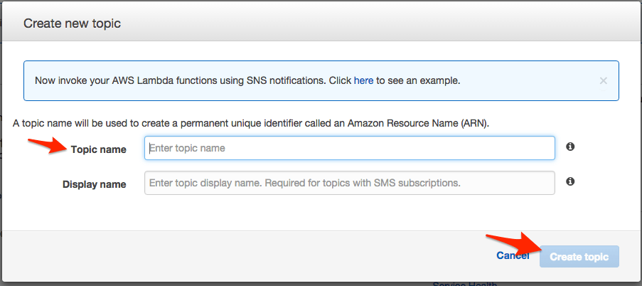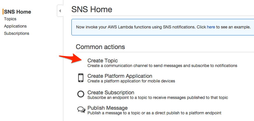 - In the SNS Console, click Create Topic.