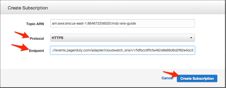 - Make sure HTTPS is the selected Protocol. Paste your SNS Webhook URL from step 3 (above) into the Endpoint field and click Create Subscription.