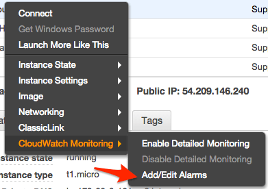 - Go to your EC2 Instances Console. Right click on the instance that you would like to monitor, and select Add/Edit Alarms.