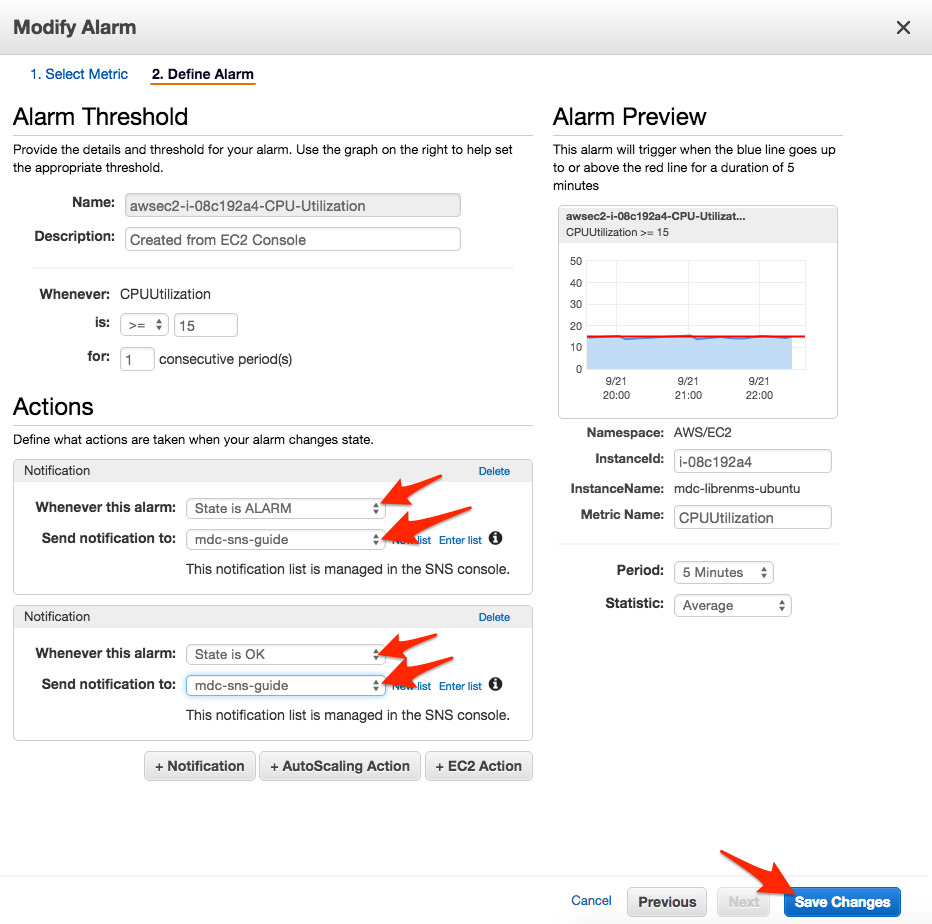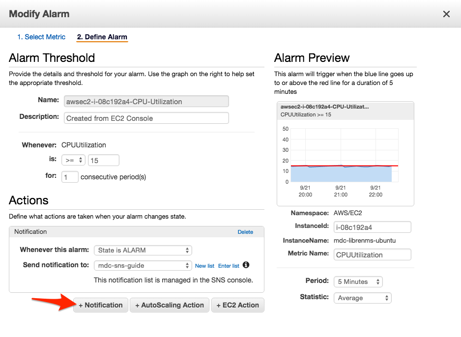 - On the Modify Alarm screen, verify your alarm threshold and settings. Add a new Action to Send Notification(s) when the alarm state reaches ALARM, by clicking + Notification.