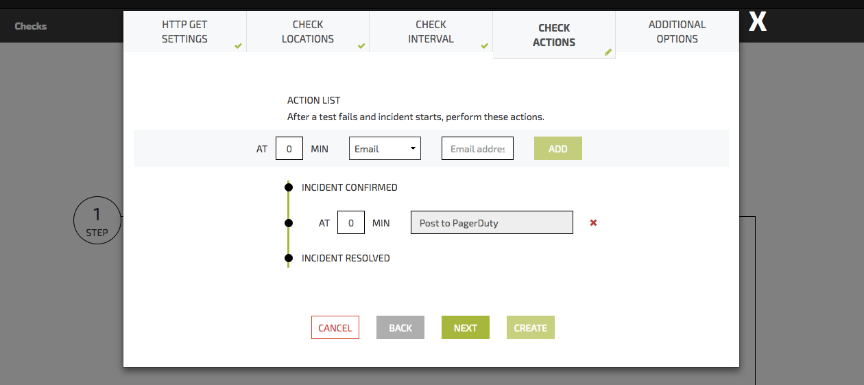 Set up your check using the wizard. Once you get to the Check Actions step, fill out the time field for your check action and select Post to PagerDuty from the dropdown. Click the Add button and finish setting up your check.