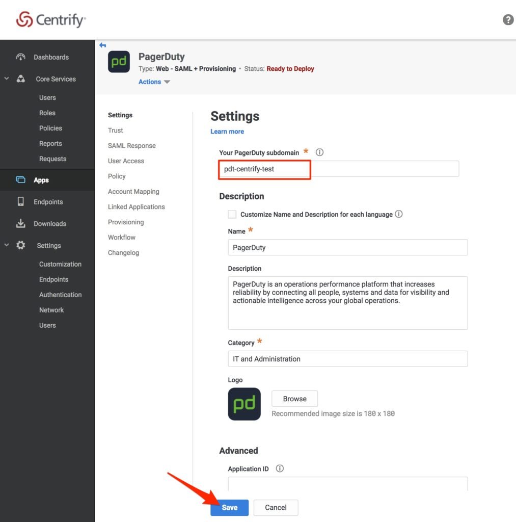 - You will be brought to the Settings page of your Application. Enter in your PagerDuty subdomain and click Save.