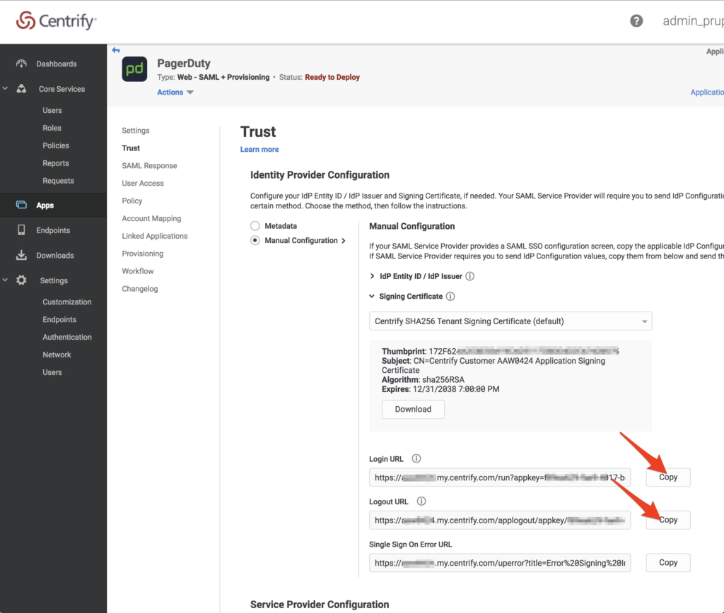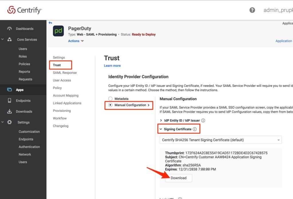 - Click Apps on the left menu and then Trust on the submenu. Choose the Manual Configuration Option. Then click Signing Certificate to expand this section, and click Download to save this file on your computer. You will need this certificate in PagerDuty so make sure to save it to a place you can find.
