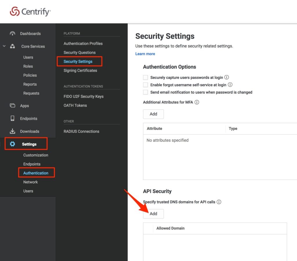 - Select Settings > Authentication on the left menu. In the submenu, click Security Settings. Under API Security, click Add.
