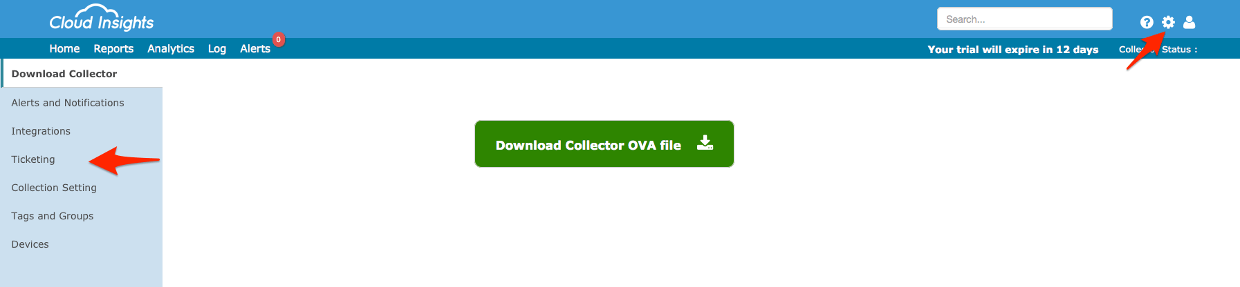 - Click on the settings gear near the top right corner of your Cloud Insights interface and click on Ticketing.