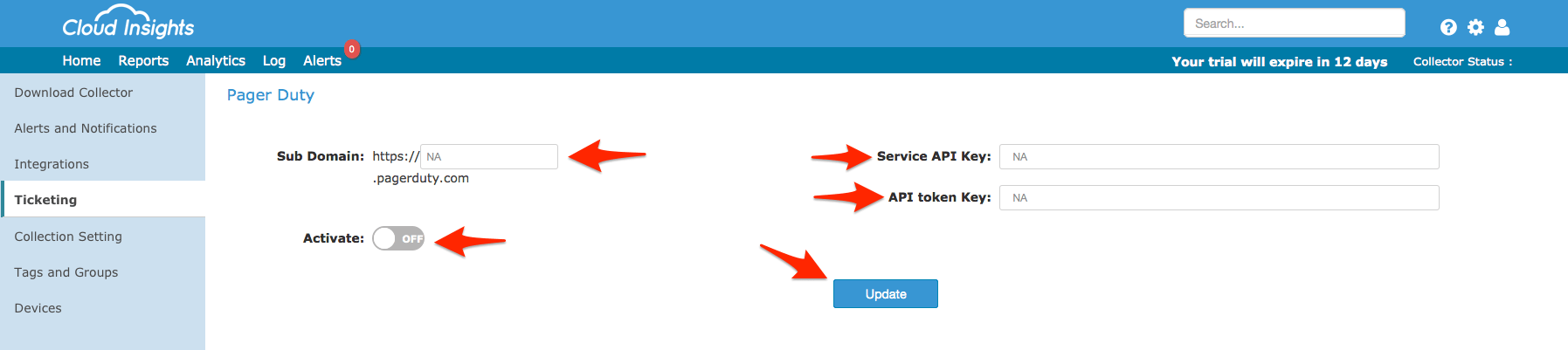 - You'll need to fill out the PagerDuty Sub Domain, Service API Key (Integration Key) and API Token. Be sure that Activate is set to On, then click Update.