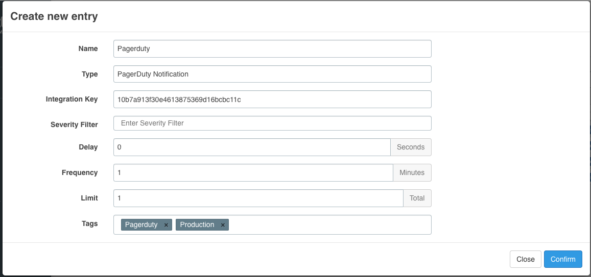 - Specify a name for the notification. Select PagerDuty Notification for type. Copy the Integration Key from PagerDuty to the Integration Key field. Set Delay to "0" and Frequency and Limit fields to "1". Specify any tags to relate Server / Instance entities to the Notification. Click Confirm to add the notification.
