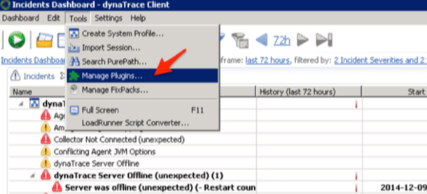 - Open the Dynatrace Client Application, go to the Tools menu, then select Manage Plugins.