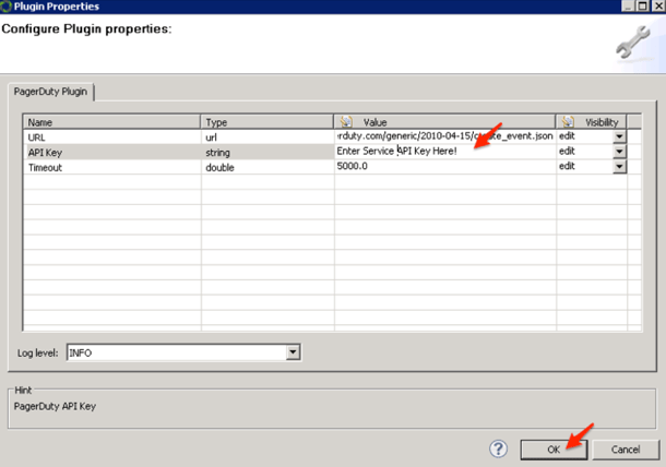 - Enter the Integration Key from PagerDuty in the API Key field and click OK.