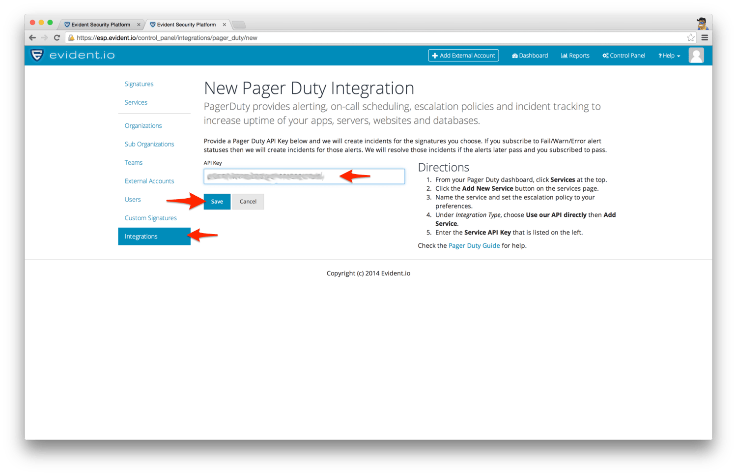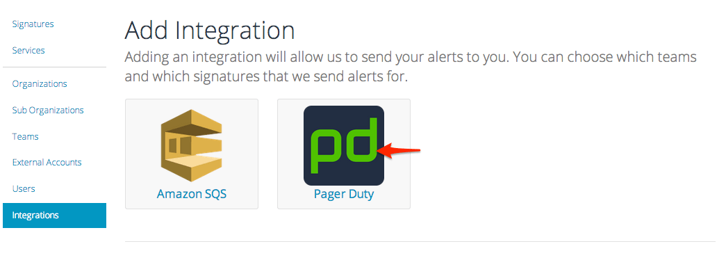 1. Login to the Evident.io control panel, go to Integrations, then click the PagerDuty icon.