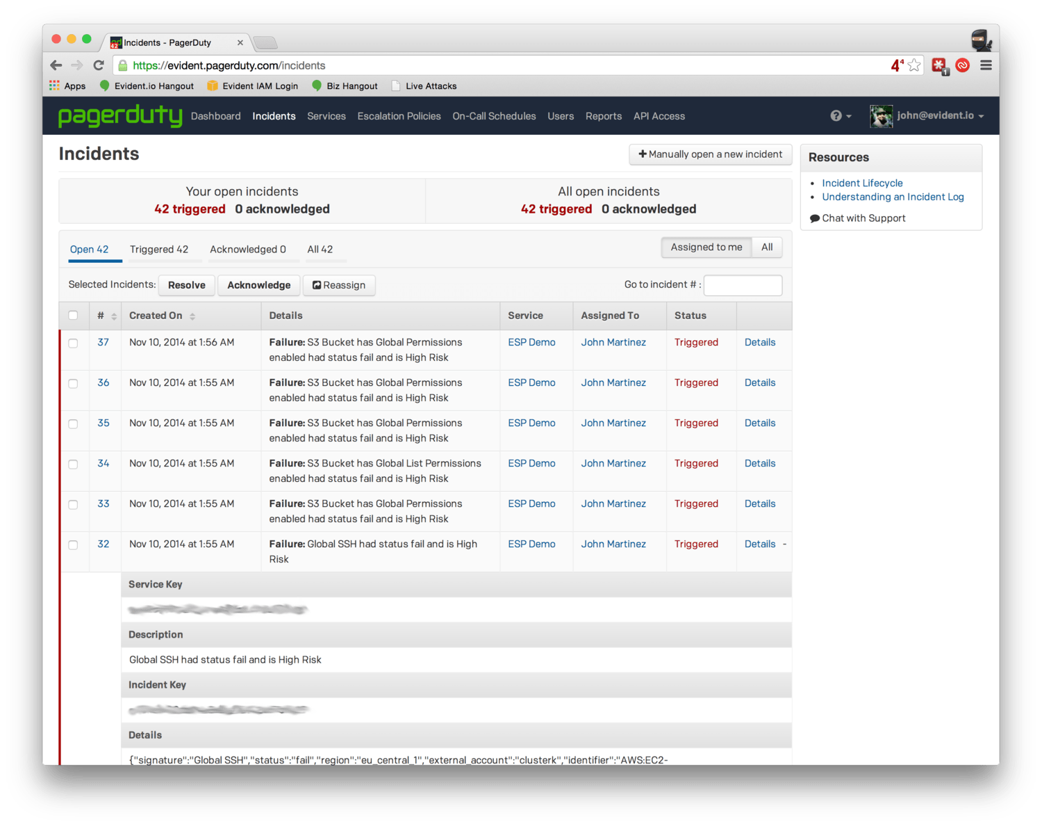 The Evident Security Platform (ESP) performs continuous AWS security monitoring as a service and can identify and assist you in correcting problems in as little as 5 minutes. ESP for AWS identifies over 100 critical AWS security vulnerabilities across all of your AWS accounts. It can be easily configured to send alerts to PagerDuty, thus allowing you to take advantage of PagerDuty’s comprehensive alerting and incident tracking functionality. The guide below describes how to integrate Evident.io (ESP) with PagerDuty.