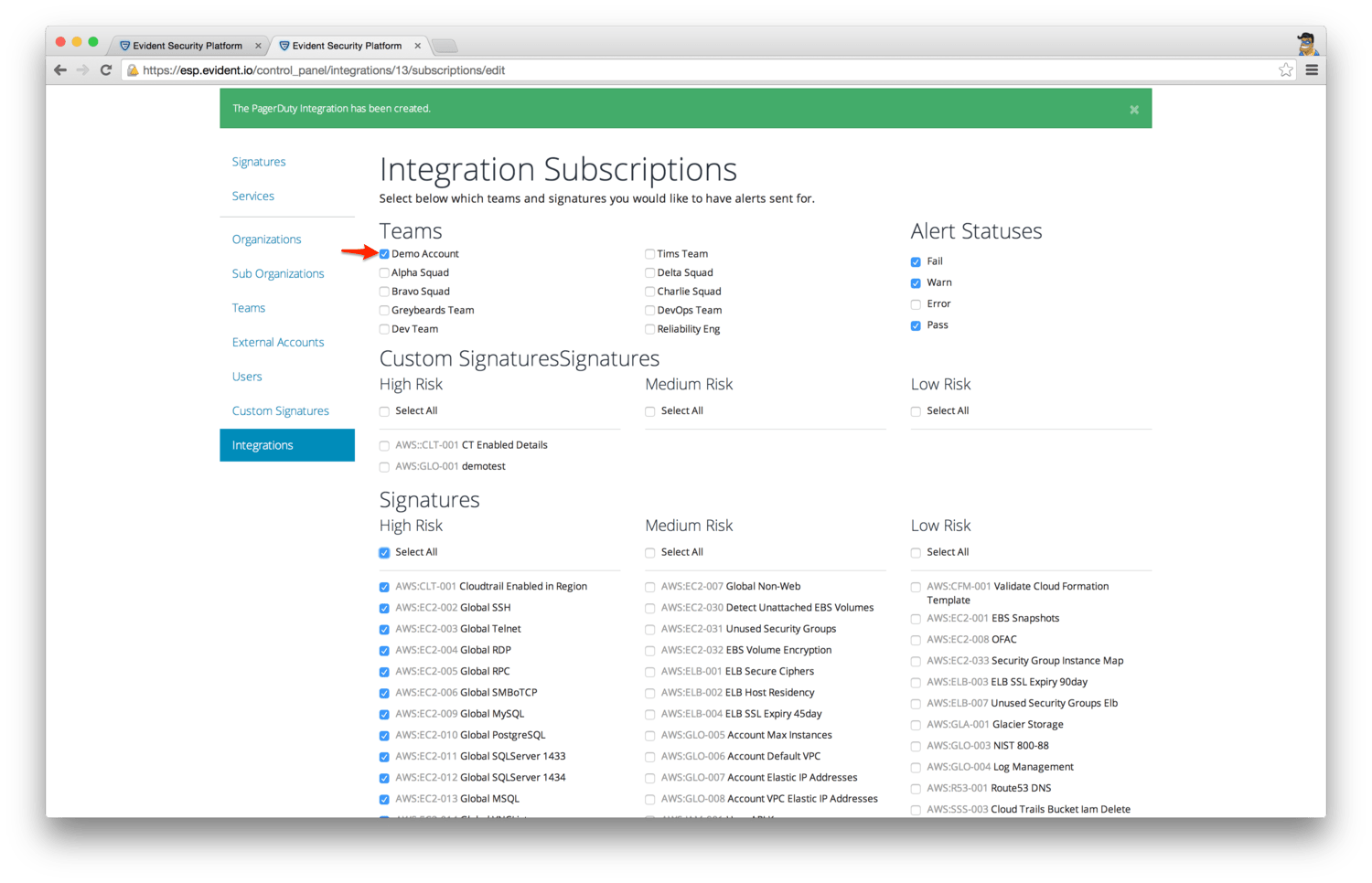 Congratulations - the integration is now complete! Now when an alert fires based on one of your Evident.io signatures and rules, a PagerDuty incident will be triggered.