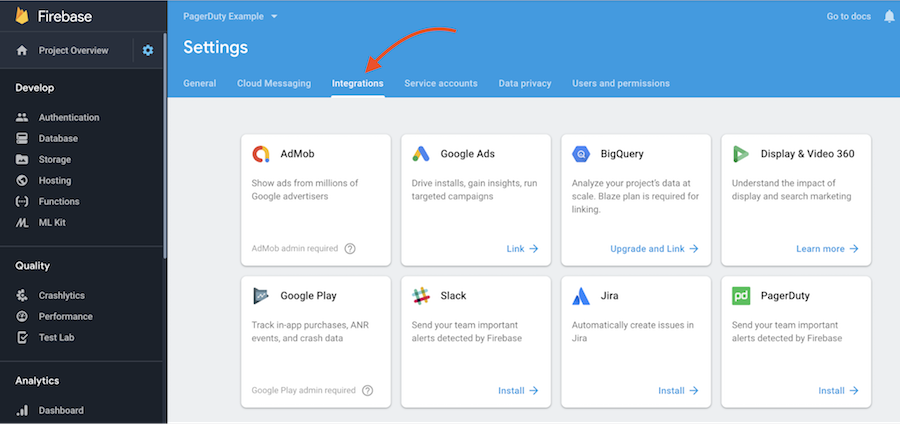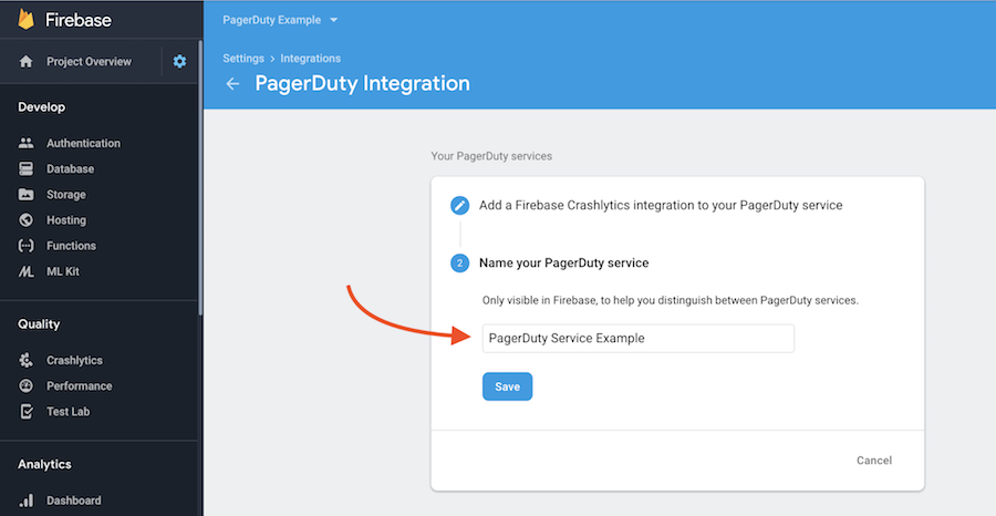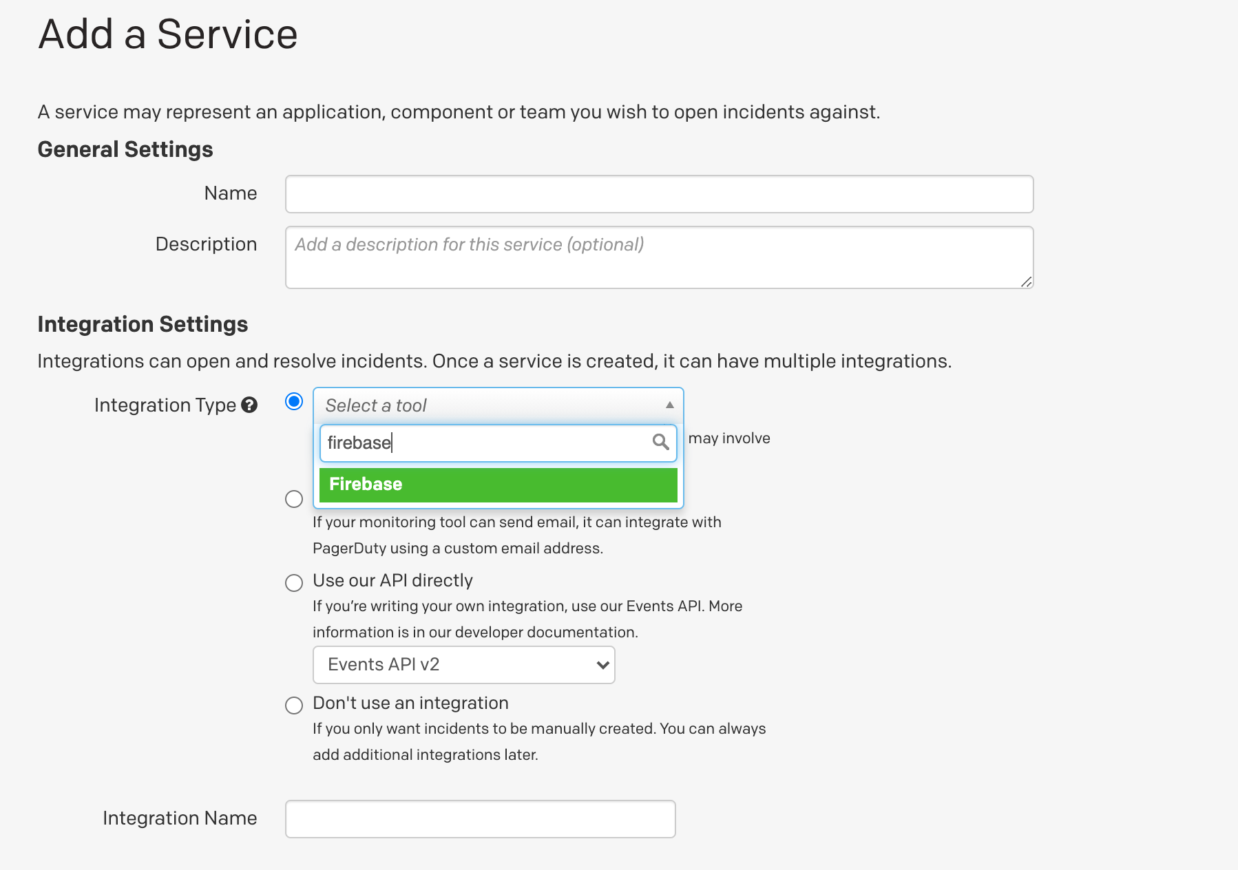 There are two options for integrating with Firebase. Creating a new PagerDuty service, or adding an integration to an existing service.