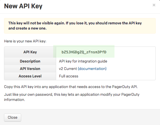 - Once you click Create Key, you will see a dialog displaying your key and confirming the options you filled in on the previous step. Make sure to copy this key into any application that needs it now, as you will not have access to the key after this step. If you lose a key that you created previously and need access to it again, you should remove the key and create a new one. Click Close once you have successfully copied your key.
