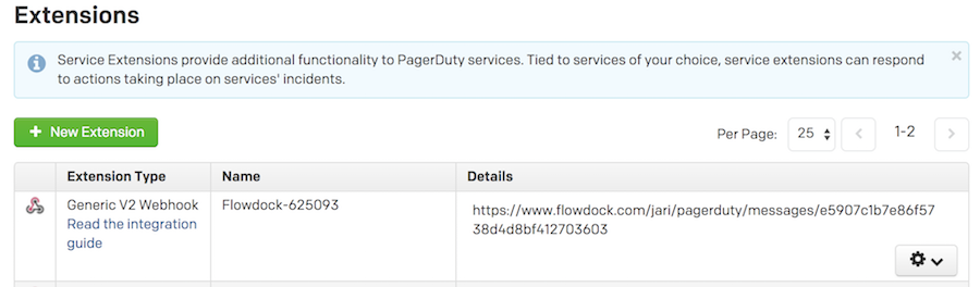 Now when you go to your chosen Service in PagerDuty you'll see an extension webhook for Flowdock on the Integrations tab. Note that changing the Endpoint URL or deleting this extension will break your integration, so be careful!