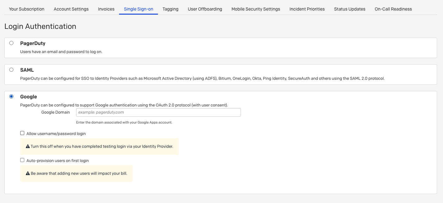 Please note that you must be the Account Owner of your PagerDuty account and an Administrator of your G Suite account in order to make these changes. Additionally, SSO capabilities within PagerDuty are only available on our Business and Digital Operations plans. Please contact our sales team if you are interested in upgrading your plan.