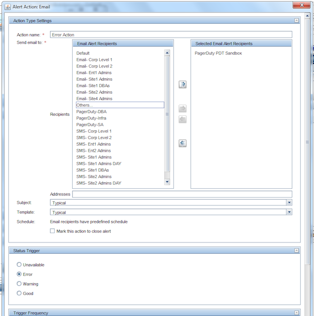 PagerDutyIncidentKey: <siteScopeHost>/<groupID>/<name>/<alert::name> Time: <time> Alert: <alert::name> Monitor: <name> Group: <FullGroupId> Status: <state> Metrics in error: <errorOnly> Metrics in warning: <warningOnly> SiteScope URL: <newSiteScopeURL> - In the SiteScope user interface, right click on the context-tree, and select New > Alert.