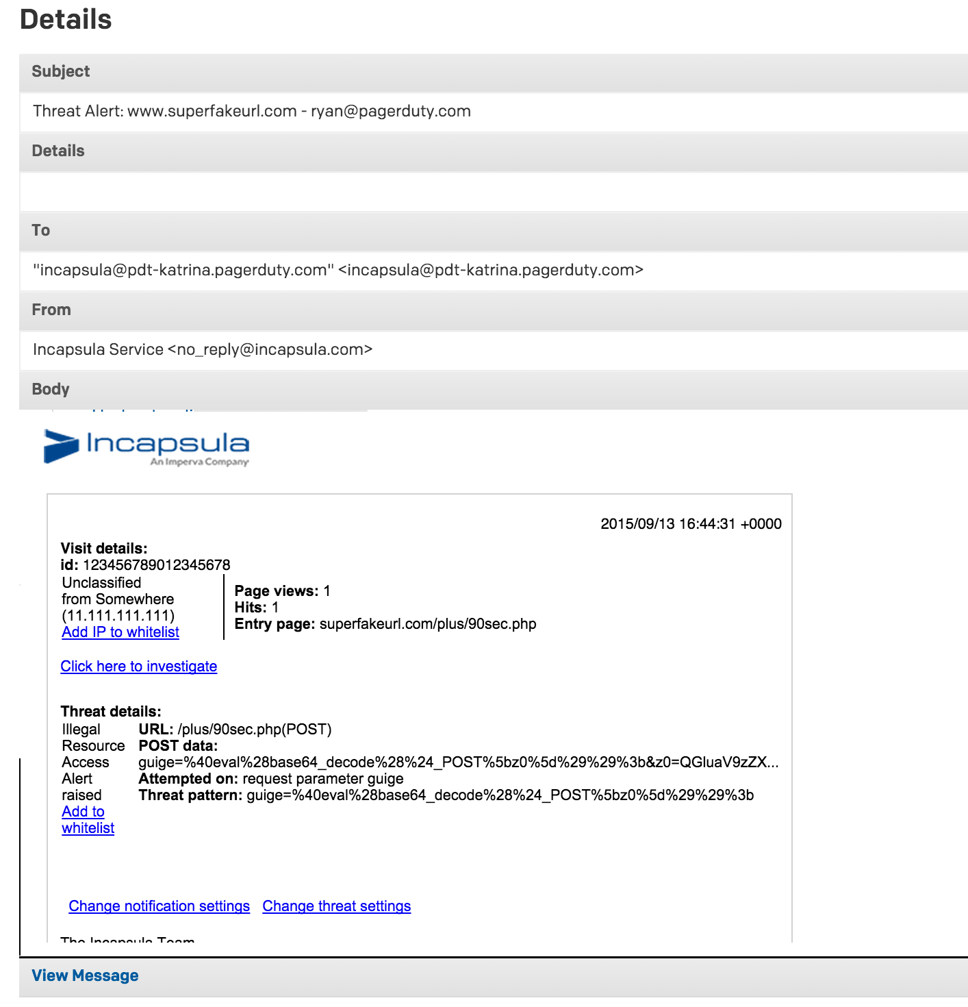 With the growing number of attacks targeting organizations worldwide, operations teams are under more pressure than ever to stay on top of the increasing number of incidents. By using PagerDuty, Imperva Incapsula customers can now better manage incident response. Incapsula's integration with PagerDuty gives your ops teams the tools they need to be more responsive to the growing volume of threats.