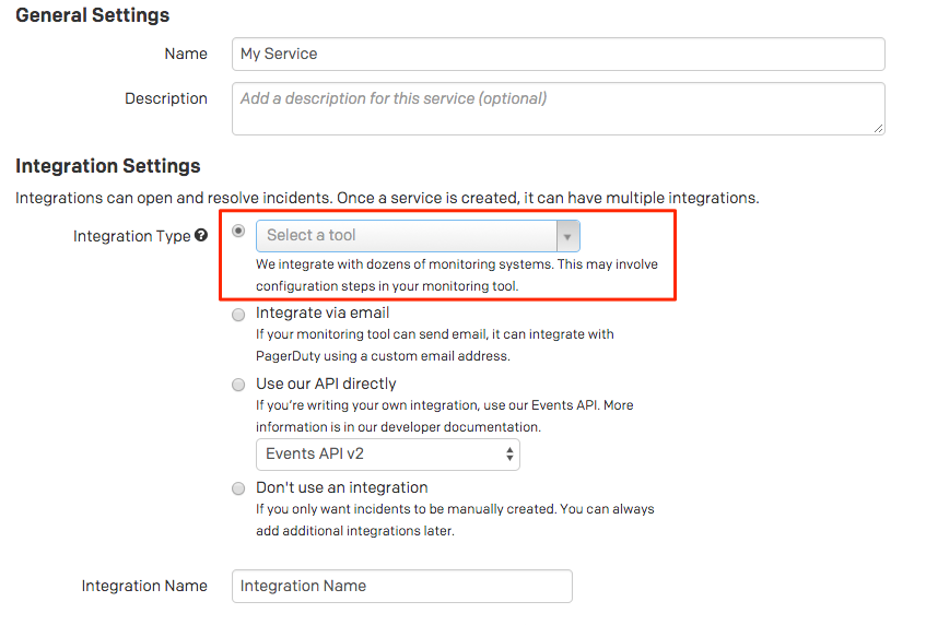 - Enter an Integration Name. If you are creating a new service for your integration, in General Settings, enter a Name for your new service. Then, in Incident Settings, specify the Escalation Policy, Notification Urgency, and Incident Behavior for your new service.