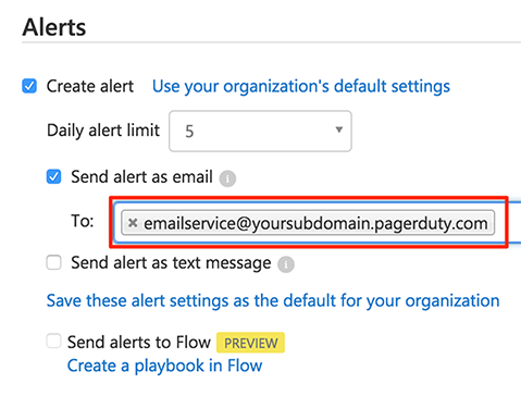 - Under Alerts check Send alert as email and enter your PagerDuty integration email.
