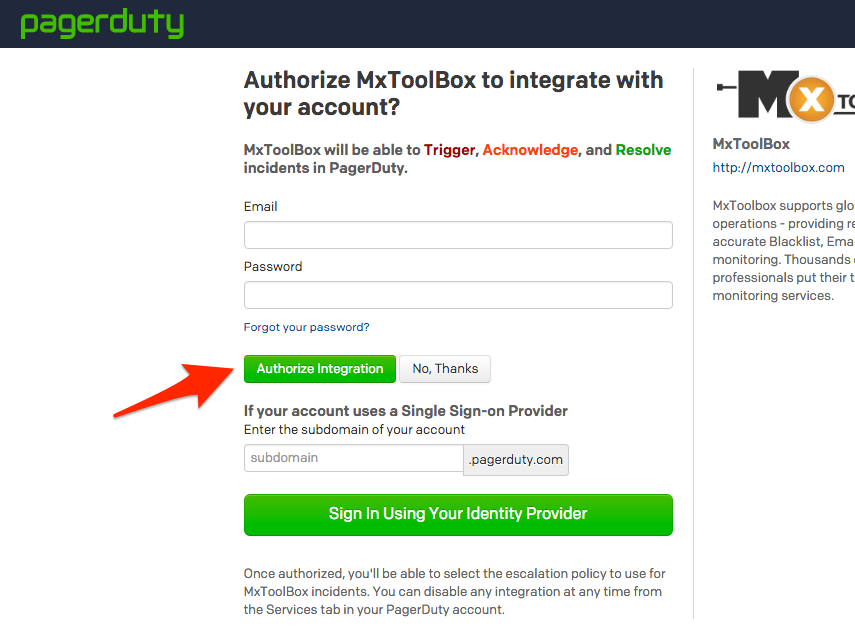 - Once you select Authorize Integration you will be redirected back to your notification policy in MxToolbox and your integration will be complete.