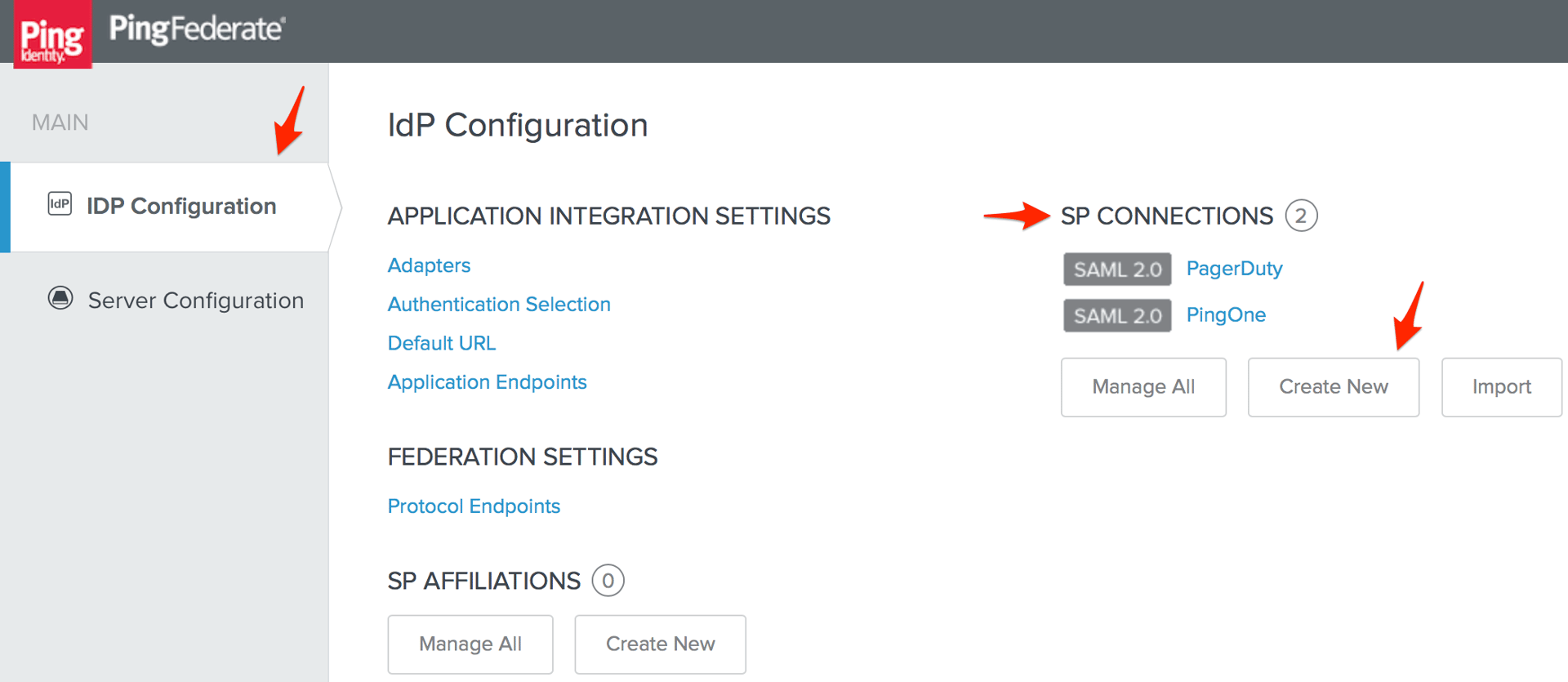 - Go to the IdP Configuration page in PingFederate, then click Create New under SP Connections.