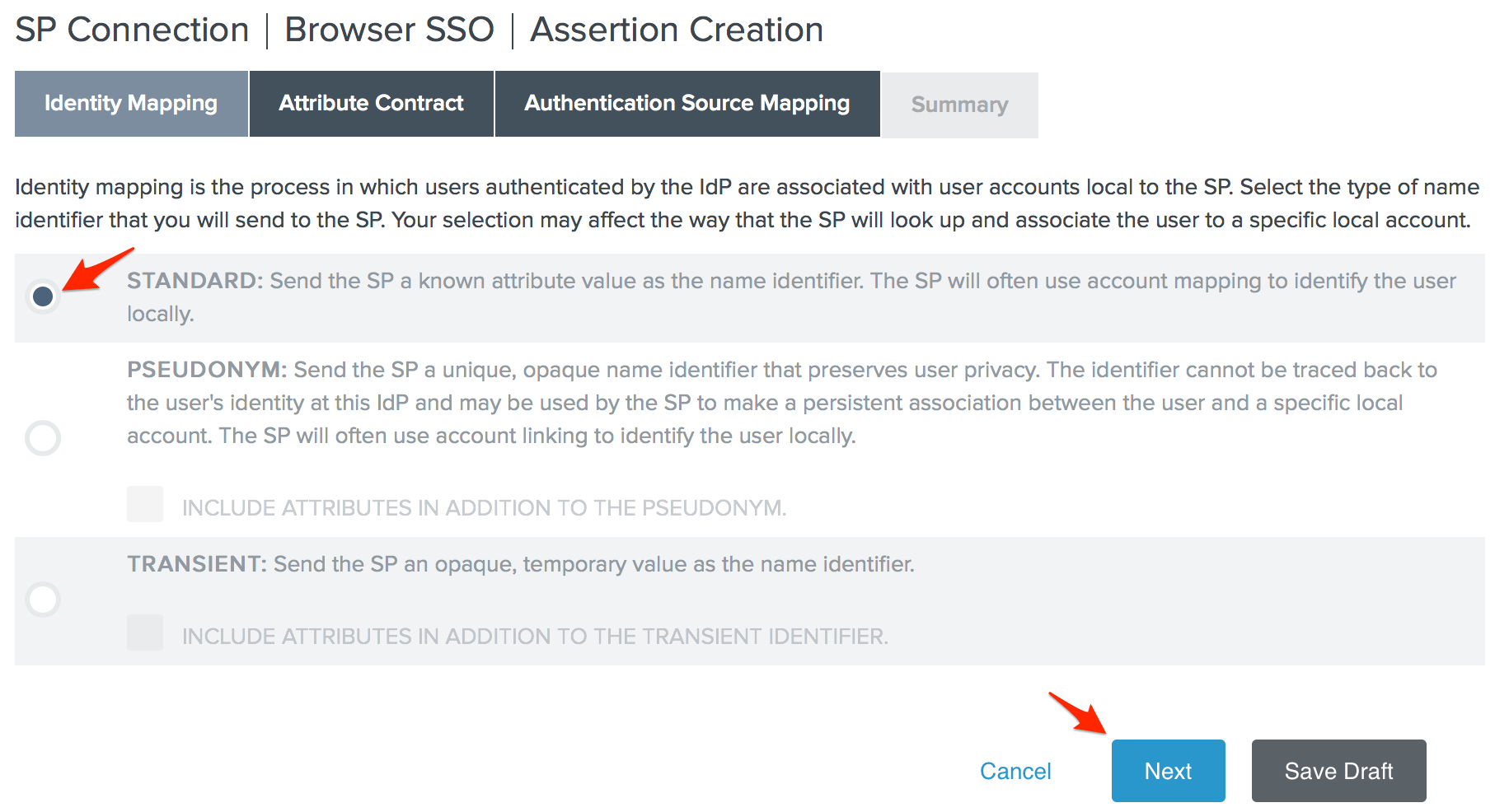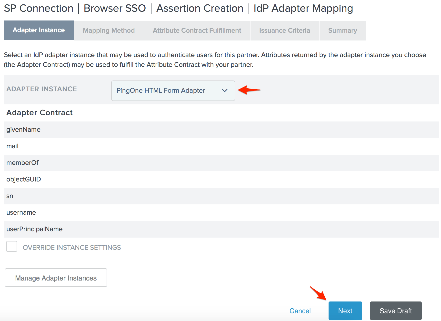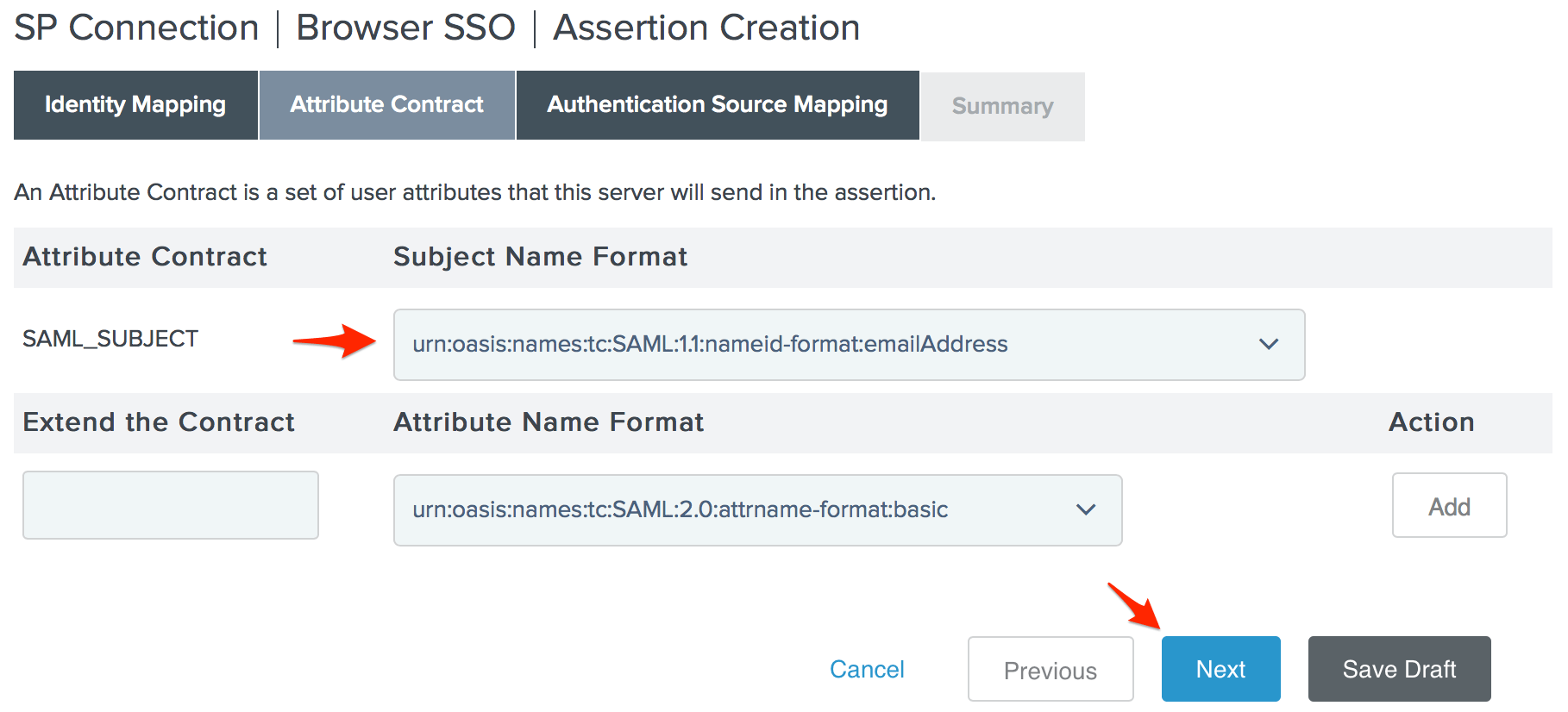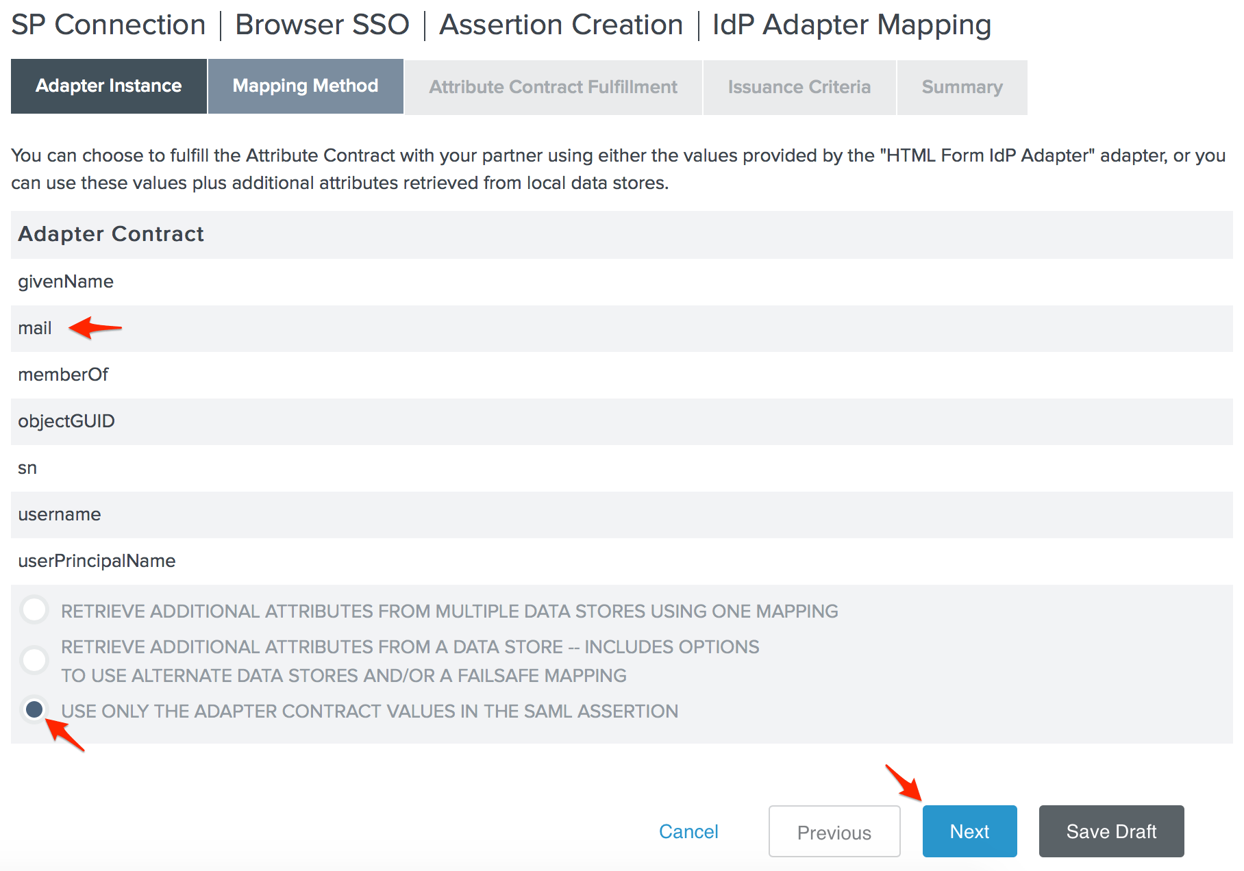 - The adapter we chose for our environment provides the user's email address, so we can select the Use only the adapter contract values in the SAML assertion option and click Next.