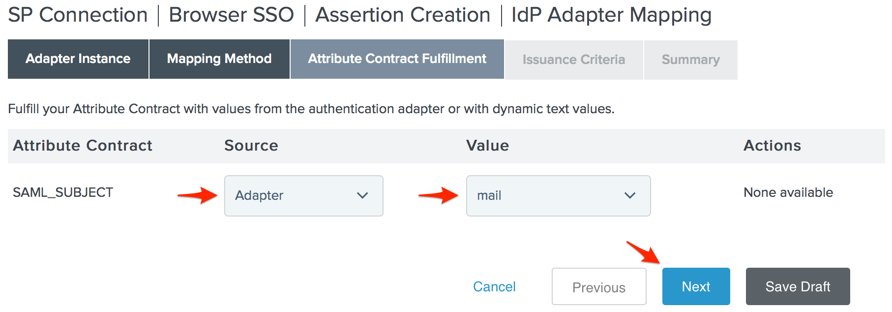 - Set your SAML_SUBJECT Source to your Adapter, and its Value to the user's email address, then click Next.
