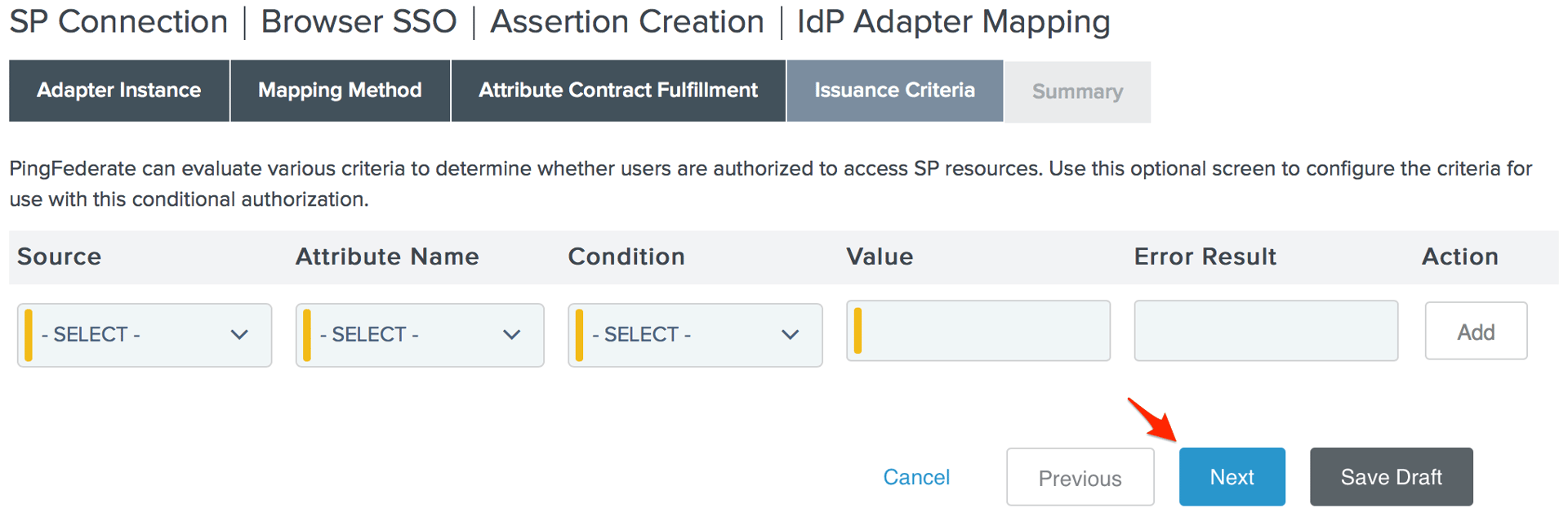 - Specify any authorization conditions you would like (if any) on the Issuance Criteria page, then click Next.