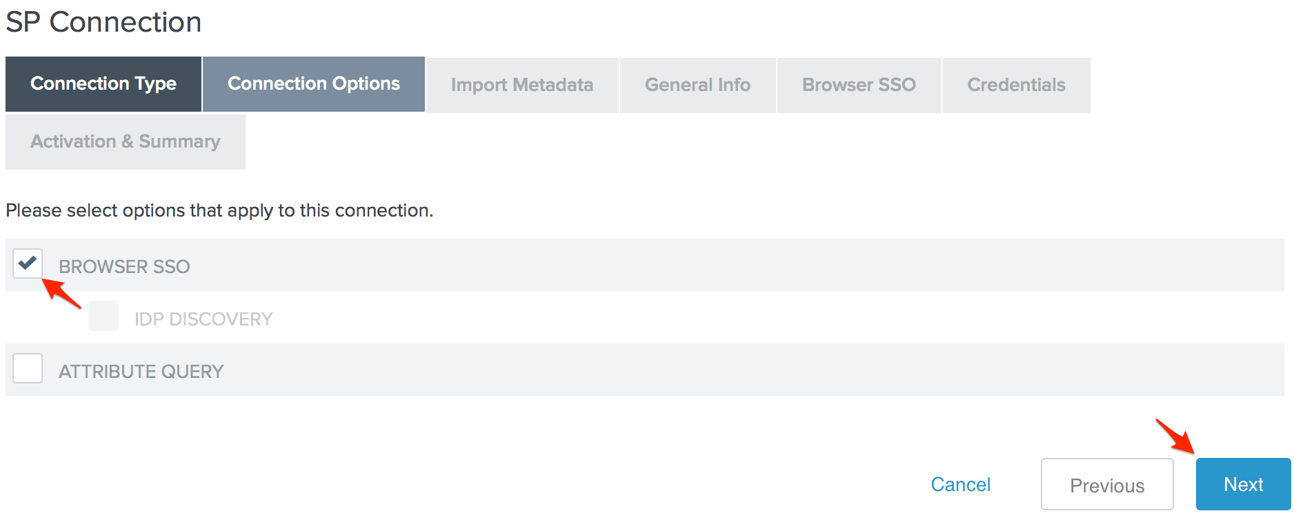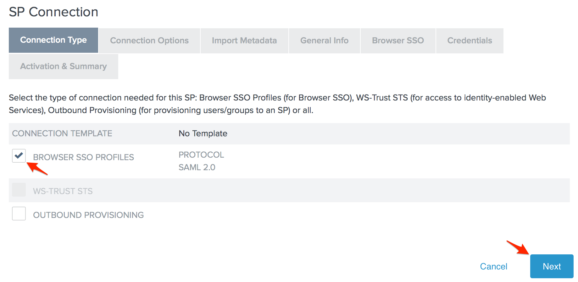 - Check the Browser SSO Profiles connection template on the Connection Type page and click Next.