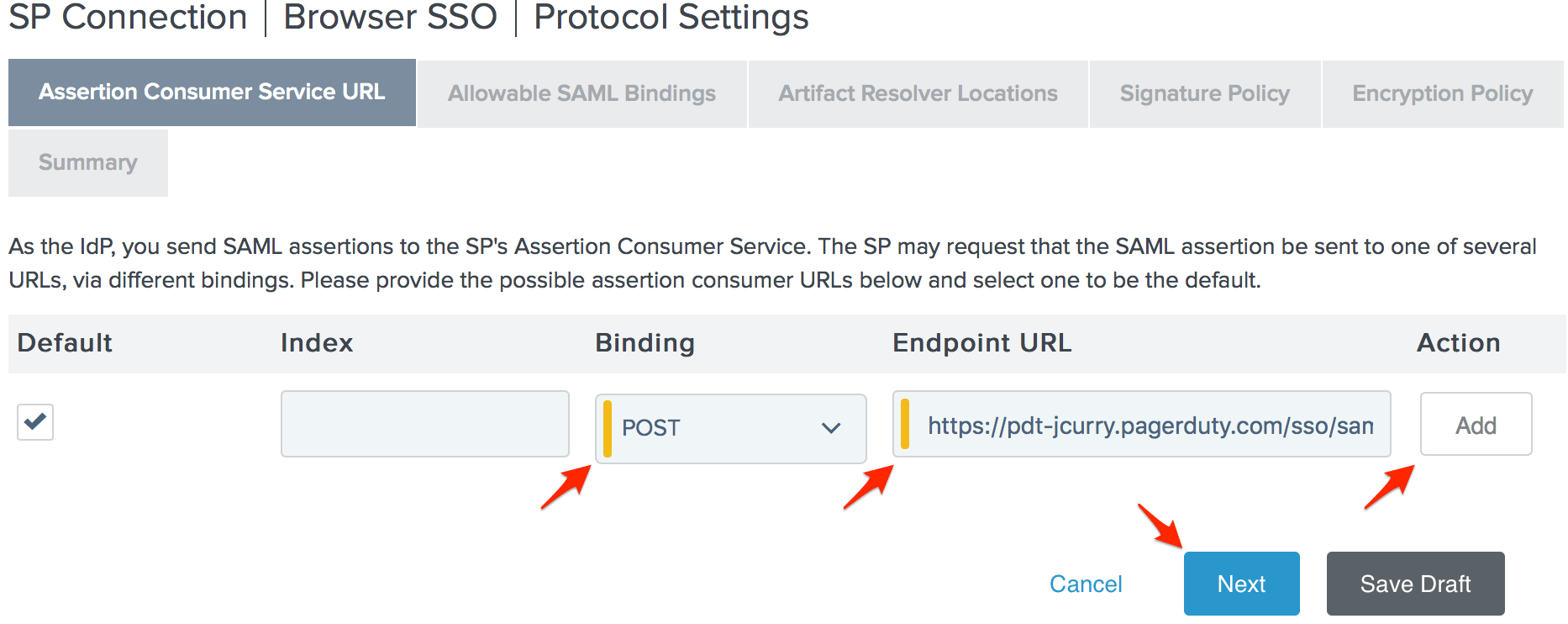 - Set the Binding to POST and paste the SAML Endpoint URL you copied from PagerDuty in step 10 in to the Endpoint URL field, then click Add and Next.
