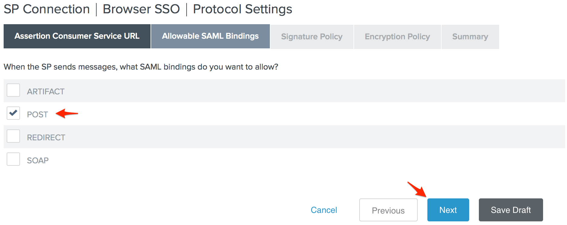 - Check POST on the Allowable SAML Bindings page and click Next.